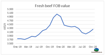 歐洲市場繼續(xù)受到第二波新冠疫情的影響。德國餐館將近四周處于關閉狀態(tài),阿根廷希爾頓臀腰肉的成交價也反映了這一事實。有人提供希爾頓臀腰肉成交價6500-7000美元/噸,因為大多數(shù)工廠只能選擇把這些產品冷凍起來,除此之外別無選擇,只能把庫存賣掉。烏拉圭方面大多數(shù)工廠選擇從目前的貿易中撤退。無論如何,工廠相信,如果在11月剩余時間內病毒的傳播能夠得到控制,12月的需求可能會有所變化。最令人擔憂的問題之一是481配額的谷飼牛的數(shù)量。原則上,歐洲客戶要求的是將生產推遲2-3周。目的是盡可能延長貨物的到港時間,以延長售賣時間,希望疫情可以開始改善。如果把客戶案例逐個分析,首先的想法是盡快裝船,以便貨物可以在一月初清關,利用配額窗口的關稅優(yōu)勢,然后冷凍起來轉賣給進口商。工廠稱最有效的辦法是把活牛留在育肥場,等到下個季度配額開始(4-6月)再進行屠宰。我們有信心歐洲市場將迅速恢復起來,經(jīng)過短暫的封鎖之后市場將在30-40天內恢復正常。