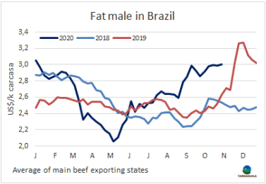 供應短缺、月初的高需求和出口市場的良好表現(xiàn)繼續(xù)支撐巴西主要牛產區(qū)活牛價格上漲。圣保羅方面參考價達270雷亞爾/15公斤。為中國市場準備的小閹牛價格能多賣2雷亞爾/15公斤。批發(fā)市場價格受月初需求拉動也有上漲,十月胴體參考價17.8雷亞爾/公斤,較上月上漲約10%。批發(fā)市場后部位肉緊缺,接下來幾天價格可能再次上漲。