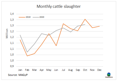 10月阿根廷牛屠宰量126萬頭,達今年以來最大。10月21個工作日平均牛屠宰量6萬頭/天,較2020年前十個月平均水平增長3%。因此今年1-10月牛屠宰量達1160萬頭,相當于帶骨牛肉產量271萬噸。據(jù)市場專家稱,“預計今年屠宰將達近1400萬頭,相當于帶骨牛肉325萬噸,其中95-100萬噸將用于出口。”他預計,阿根廷國內人均年消費量將達到50公斤。與2020年9月創(chuàng)下紀錄相比,10月屠宰量增長了4.4%,10月比9月少1個工作日。較2019年9月下降了3.5%,2019年9月比今年10月多2個工作日。