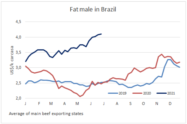 南方共同市場閹牛價格保持堅挺,南方共同市場閹牛價格指數本周上漲了1美分至3.96美元/公斤,達2010年該指數統計以來最高。巴西主要出口州育肥牛價格保持不變,由于雷亞爾升值,美元價格上漲了2美分至4.1美元/公斤。其余地區市場堅挺,參考價保持穩定。