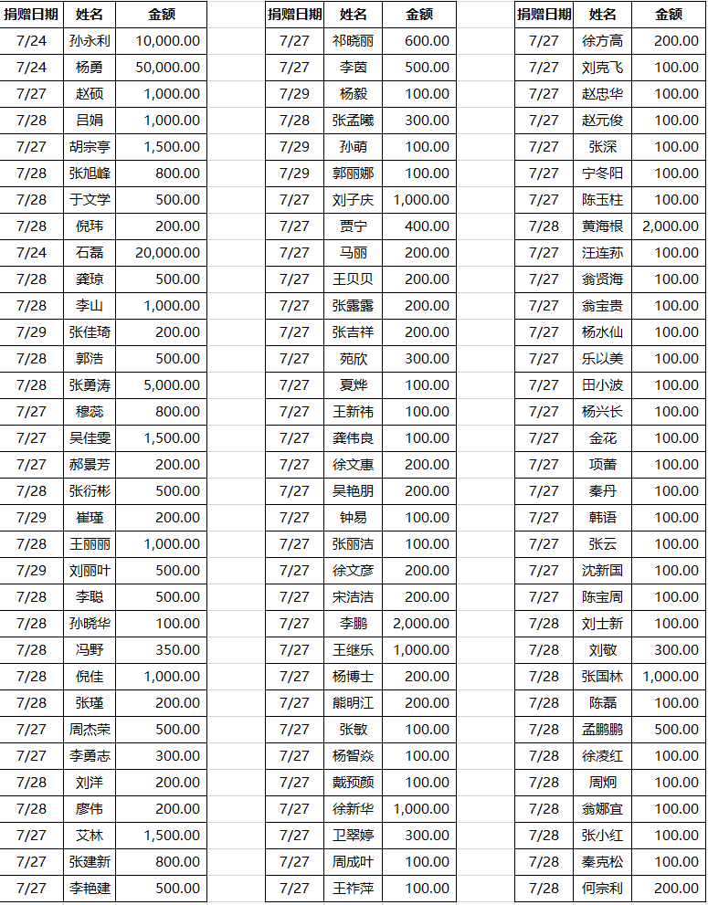 天災(zāi)無情,但壓不過泱泱大國;暴雨肆虐,但敵不過眾志成城。短短兩天時間,公司及員工共募捐720750元,包括:北京泓睿國際貿(mào)易有限公司20萬,天津泓睿食品有限公司20萬,北京大壹統(tǒng)科技有限公司5萬,上海泓瑞食品有限公司5萬,上海金亥食品有限公司5萬,北京帕爾司電子商務(wù)有限公司5萬,員工自行及公司代捐款共計120750元。此款項已于第一時間匯入河南省抗洪救災(zāi)相關(guān)賬戶。