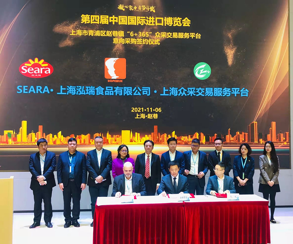 簽約儀式上,巴西集團旗下的SEARA MEATS與北京泓睿&上海泓瑞食品有限公司和上海眾采企業發展有限公司簽約。