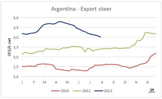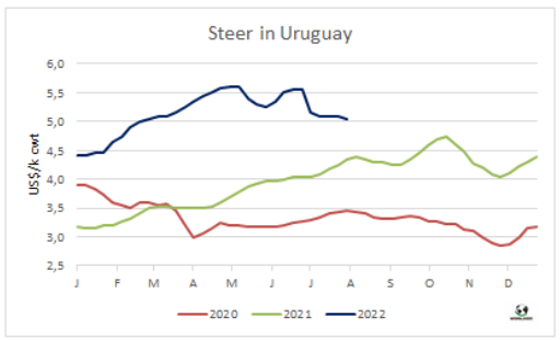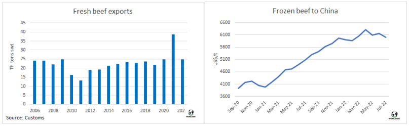 在牛肉出口量上可以感受到屠宰量的劇烈減少。據(jù)海關(guān)發(fā)布的數(shù)據(jù),七月烏拉圭牛肉出口量24863噸,達(dá)2020年八月至今兩年以來最低水平,平均出口離岸價7144美元/噸,環(huán)比下降了1.2%。中國仍是主要出口目的地,盡管對中國出口量較此前幾個月略有下降。平均每出口三噸牛肉其中兩噸出口到中國(65%),今年一月和三月對中國牛肉出口量占比曾達(dá)到72%。對中國出口的均價開始下跌。冷凍去骨牛肉平均出口價格為6504美元/噸,比6月份下跌了118美元,比4月的最高點下跌了275美元(4%)。冷凍帶骨牛肉平均價格較上月下降了264美元(5.5%)至4523美元/噸。今年前7個月,烏拉圭出口牛肉出口量累計23.8萬噸,平均出口價格7002美元/噸,出口量同比增長了5.5%,平均價格同比增長了29%。