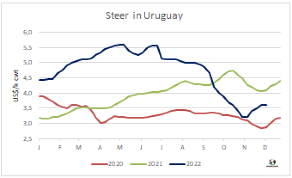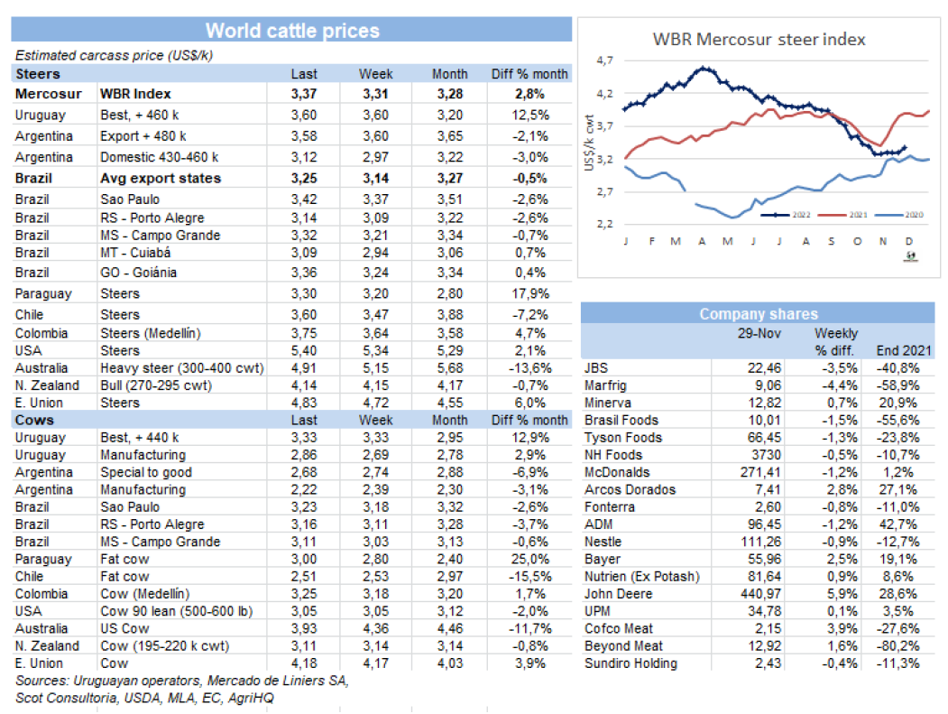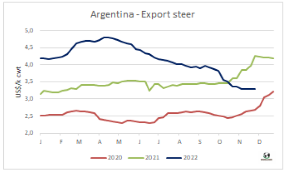 南方共同市場(chǎng)閹牛價(jià)格指數(shù)離開過(guò)去五周的窄幅波動(dòng)區(qū)間,本周該指數(shù)上漲了6美分,至3.37美元/公斤,主要受巴西牛價(jià)上漲的拉動(dòng)。巴西主要出口州育肥牛價(jià)格上漲11美分至3.25美元/公斤,主要因?yàn)槔讈啝杻r(jià)格上漲,以及匯率升值1.5%。巴拉圭方面,價(jià)格也有上漲,待宰閹牛價(jià)格上漲了10美分至3.3美元/公斤。阿根廷方面,出口閹牛比索價(jià)格上漲匯率下降導(dǎo)致美元價(jià)格下跌2美分至3.58美元/公斤。烏拉圭連續(xù)四周的上漲趨勢(shì)停止,本周牛價(jià)保持3.6美元/公斤。