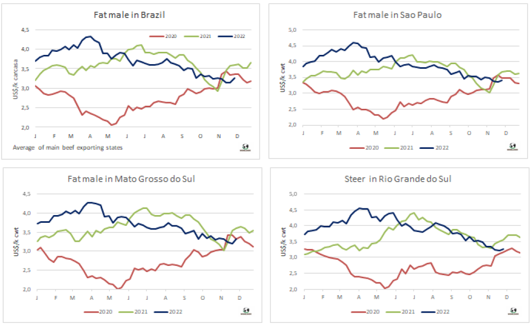 Agrifatto咨詢公司的畜牧經(jīng)理預(yù)測(cè),隨著公牛和母牛屠宰量的同步增加,牛肉價(jià)格應(yīng)該在年末幾周下降。在馬托格羅索的一次采訪中,他說(shuō),在消費(fèi)較低的時(shí)候,市場(chǎng)上肉類供應(yīng)增加,這應(yīng)該會(huì)轉(zhuǎn)化為終端消費(fèi)下個(gè)的下降。農(nóng)民已經(jīng)感受到了價(jià)格的下降,與去年同期相比,育肥牛價(jià)格下降了11%,但消費(fèi)者還沒(méi)有感受到。Agrifatto預(yù)測(cè),隨著國(guó)內(nèi)市場(chǎng)的供應(yīng)進(jìn)一步增加,牛肉價(jià)格的下跌將持續(xù)到2023年。