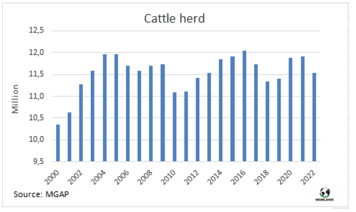 上半年烏拉圭牛存欄較預(yù)期減少35.1萬(wàn)頭