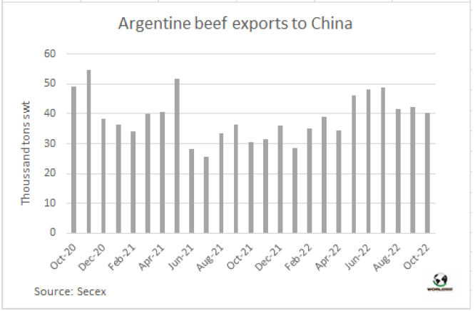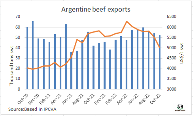 10月阿根廷牛肉出口量環(huán)比下降了6%,同比增長(zhǎng)25%