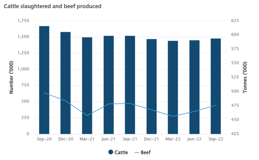 據(jù)報(bào)道,與2022年7月相比,澳大利亞在2022年9月當(dāng)季牛屠宰量增加了1.9%至150萬(wàn)頭,牛肉產(chǎn)量增長(zhǎng)了2.3%至475628噸。在年度比較中,屠宰量同比下降了2.5%,產(chǎn)量同比下降了0.7%。母牛的屠宰率達(dá)44%,這表明今年最后一個(gè)季度牛群的重建仍在繼續(xù)。另一方面,全國(guó)羊屠宰量同比增長(zhǎng)了2%,至592萬(wàn)頭,羊肉產(chǎn)量同比增長(zhǎng)7.2%,至14.51萬(wàn)噸。
