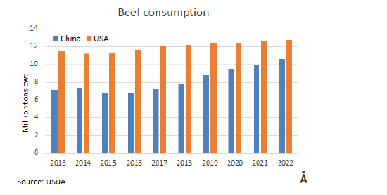 八年來,中國的牛肉消費增長了60%