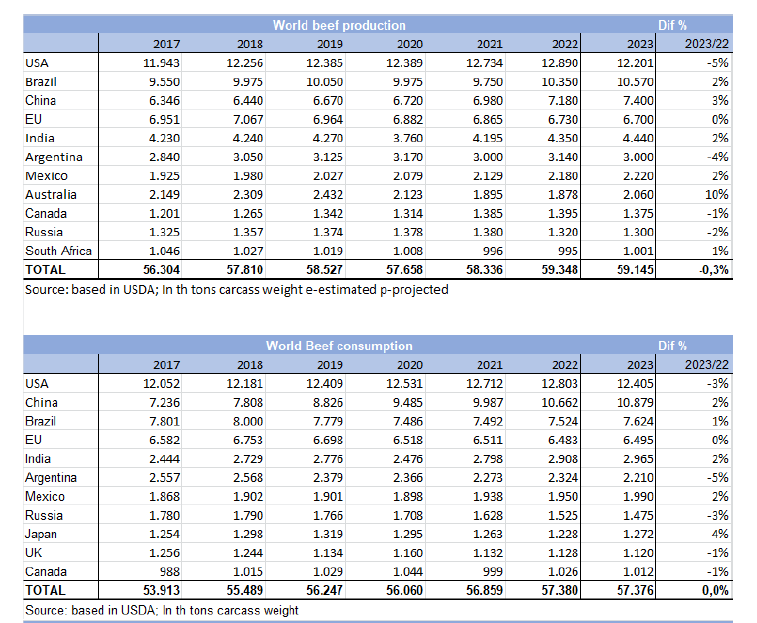 根據美國農業部上周發布的預測,主要的牛肉出口商會保持其對國際市場的穩定銷售量,一些國家的銷售量減少將被其他國家的增長銷量所抵消。三個主要出口國巴西、澳大利亞和印度將增加銷量,而其他國家(美國、阿根廷、烏拉圭、巴拉圭和新西蘭)將減少銷量,因此最終平均下來銷量與2022年非常相似。南方共同市場、大洋洲、北美和印度的總銷量約為1070萬噸,比去年增加6.7萬噸。