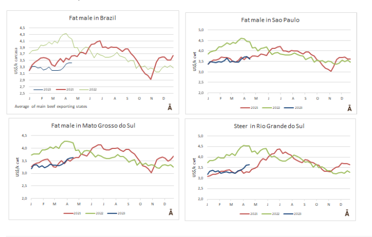 根據外貿部的報告,在4月的前9個工作日中,巴西累積出口了43,246噸牛肉,均價為$4629。日出口量為4,805噸,比2022年4月出口量減少了42%。