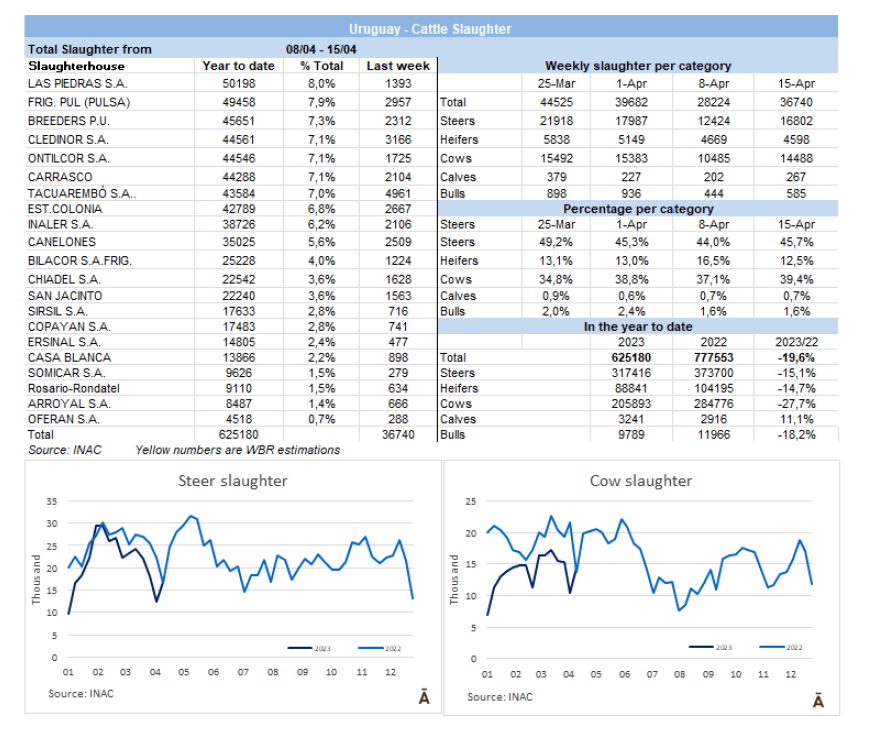 INAC報告說,有36740頭牛進入工廠,其中16802頭是公牛(占總數的46%)和14488頭母牛(占總數的39%)。本周產量最高的工廠是Marfrig-Tacuarembó ,有4961頭牛在加工,遠遠超過Marfrig-Cledinor(3166頭)和Minerva-Pulsa(2957頭)。在這一周里,Marfrig屠宰了12900頭牛,Minerva屠宰了7570頭牛。4月上半月,屠宰了68019頭牛,比2022年同期減少了34%。