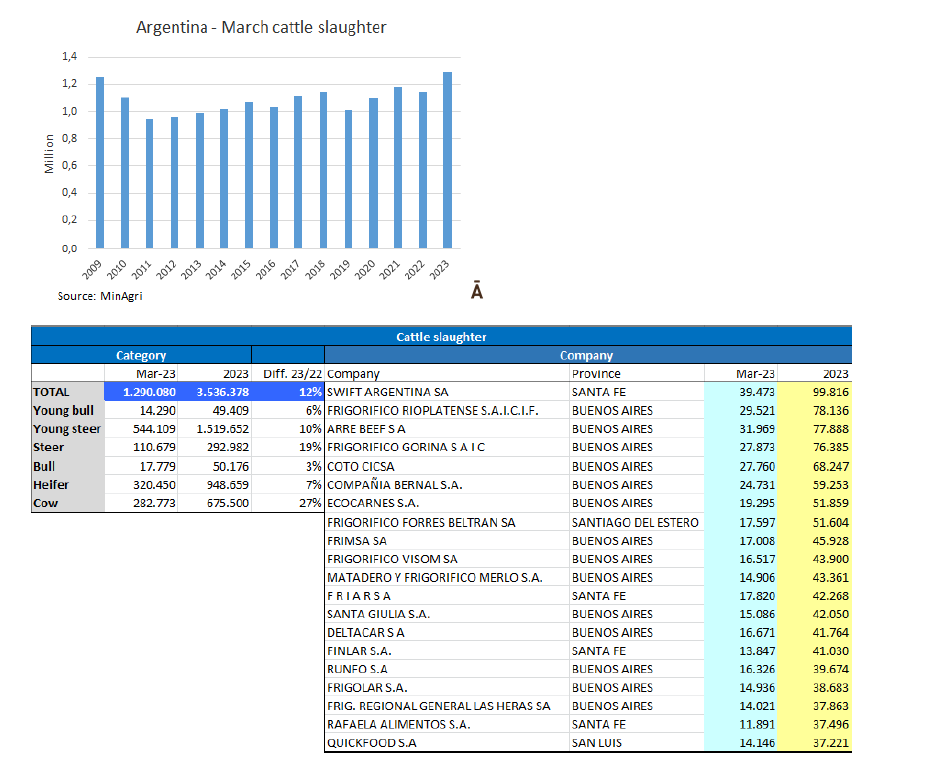 在年比較中,增幅最大的屠宰類別是母牛,尤其是年長的母牛,增長了27%,其次是閹公牛,增長了19%。母牛占2023年3月屠宰總量的46%。如果考慮工作日平均屠宰量,則有下降:在這種情況下,3 月的屠宰量與上個月相同,同比增長 7%。