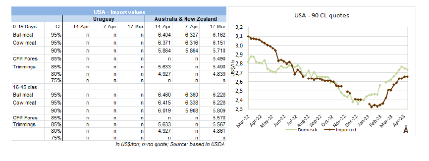 無論如何,價格沒有產生太大變化。前后腱$6800,板腱$5100,肋骨$5800,后部位肉$6000,80碎肉$3600。這些參考價格比3月底市場上的價格低約$100。一位實業家透露,鑒于最近幾周屠宰牛價格的上漲,他收到了中國出價$4000美金來收購一頭母牛四分體,并表示“這個價格讓人無法接受”。