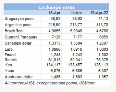 在巴西,雷亞爾升值0.4%部分抵消了主要出口州博伊戈多價格的下跌。基準指數從1美分下跌至每公斤3.42美元。