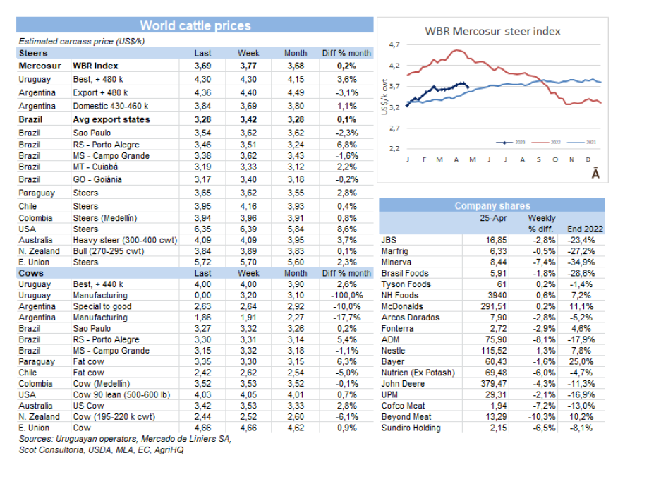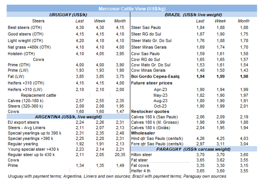 在巴拉圭,待宰公牛的最新交易價格為每公斤$3.65,但本周該行業停止購買,預計市場將面臨下行壓力。