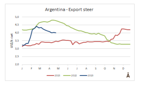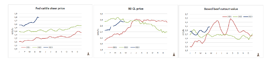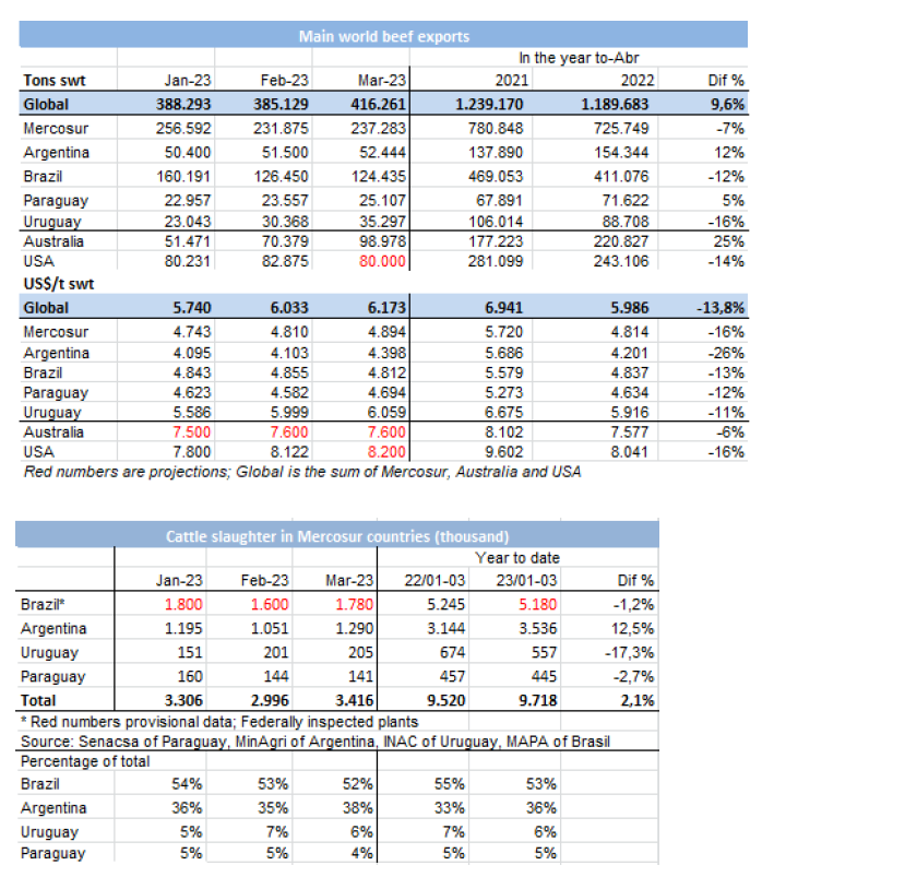 2023年前三個月,牛肉出口量達到15.6萬噸,出口額為6.542$,與上年同期相比增長13.2%,出口額下降16.4%。本季度的出口量相當于22.18萬噸帶骨牛肉。