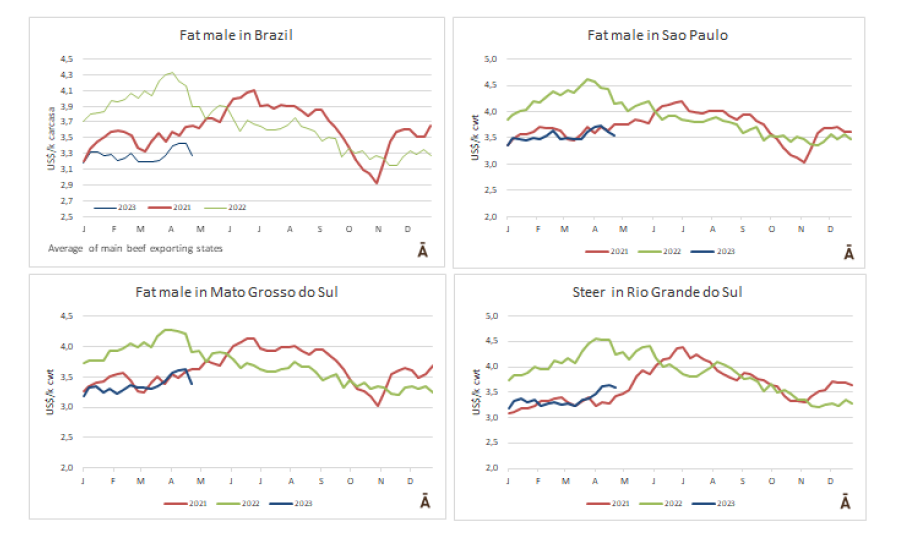 巴西主要養牛州的成品牛平均價格下跌$0.14,至$3.28/kg cwt,回到了3月底的低點。