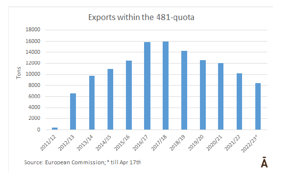 2022-2023財政年度,烏拉圭向歐盟的出口量剛剛達到8000噸,這是自2012-2013年度以來的最低數量。