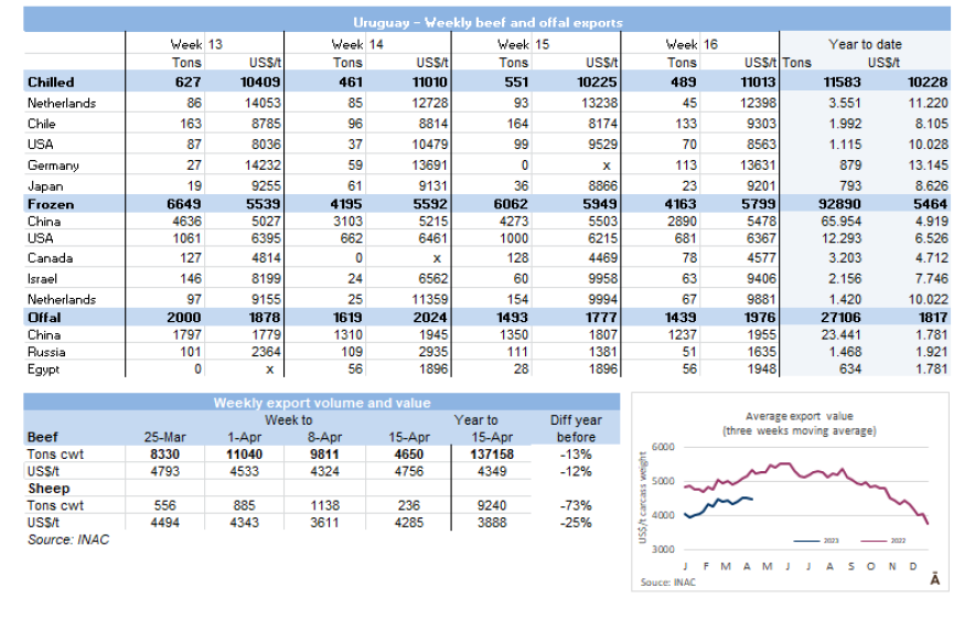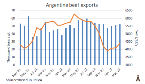 12個月的數據顯示,冰鮮和冷凍牛肉的出口量達到65.15萬噸產品重量(有93萬噸帶骨牛肉),價值$33.3億。