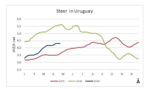 在烏拉圭出口閹牛報價為繼續穩定在4.30$/kg cwt
