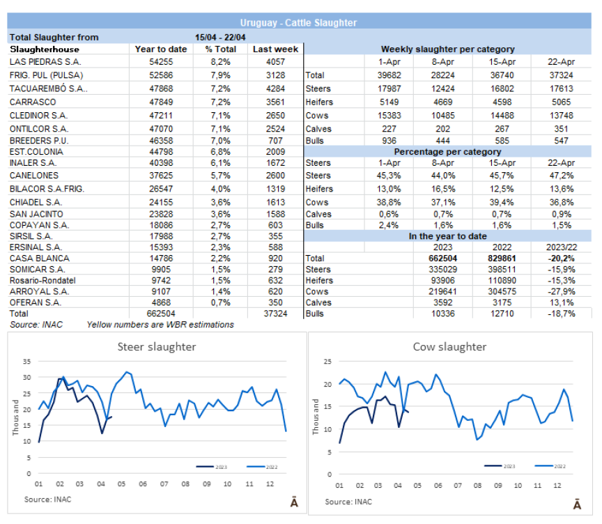 在僅剩的一周時間里,4月份累計只屠宰了105,343頭牛,因此該月傾向于以不到150,000頭動物的加工量結束,在年度比較中減少了約65,000頭。這樣一來,今年前四個月的牛屠宰量將剛剛超過70萬頭,比2022年同期減少約18萬頭(-21%)。