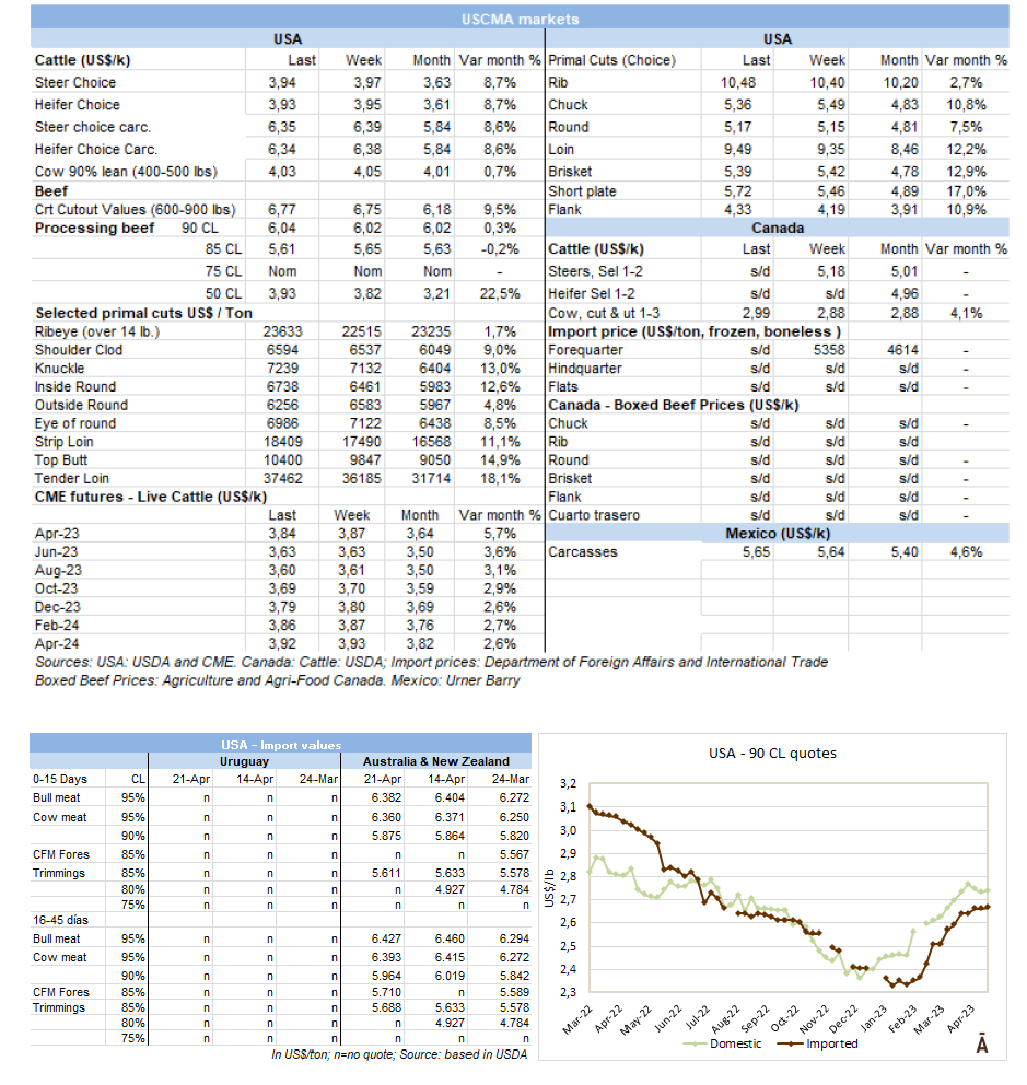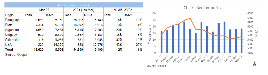 根據Odepa公布的數據,智利在2023年前三個月進口了54,959噸牛肉,均價為$5,490/噸。數量同比收縮2%,而價值中值下降6%