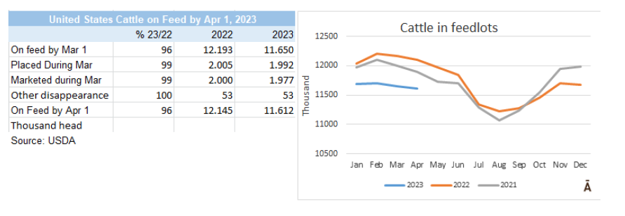 美國農業部統計4月牛存欄量為1160萬頭牛,同比去年下降了4.4%3月期間的投放量共計199萬頭,比去年低1%3月期間飼用牛的銷售量總計198萬頭,比2022年低1%。庫存包括712萬頭閹公牛,同比下降6%450萬頭小母牛,同比下降2%