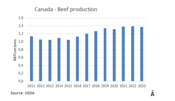 美國農業部預計2023年加拿大牛肉產量為137.5萬噸,比2022年減少2萬噸。