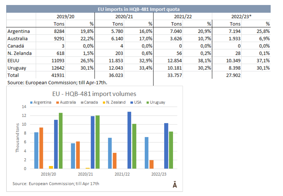 烏拉圭是第二大供應國,在2022-2023年度達到8,398噸,超過了阿根廷(7,194噸)和澳大利亞(1,933噸)。新西蘭和加拿大可以給481配額出口,但他們并沒有使用配額。