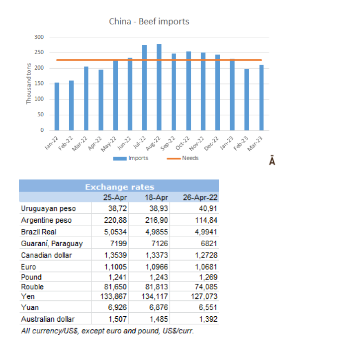 根據中國海關的數據表示,中國3月份進口了211,000噸牛肉,今年第一季度共進口了639,000噸。按照美國農業部2023年進口預期所需的進口量(每月約22.7萬噸),2023年第一季度,赤字約為4.2萬噸。