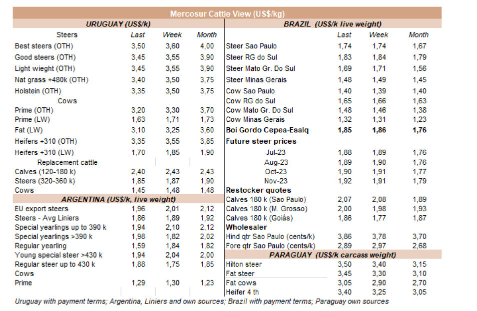 該地區(qū)屠宰用牛的價(jià)格上限和下限之間的差距繼續(xù)縮小。有最高價(jià)格記錄的阿根廷和烏拉圭保持著下行壓力,而巴拉圭和巴西的情況并非如此。