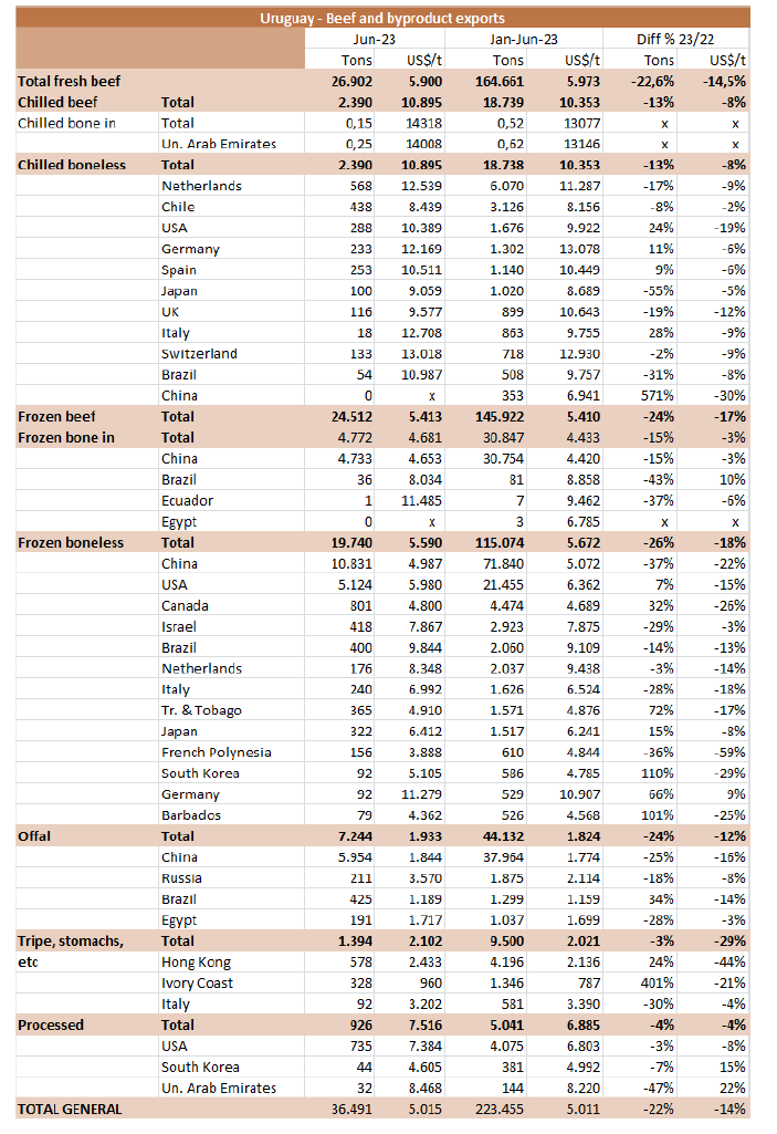根據(jù)海關(guān)報(bào)告的數(shù)據(jù),6月份,烏拉圭出口了26902噸牛肉,均價(jià)5900美元/噸。在每月的比較中,數(shù)量和中間值都下降了5%。均價(jià)擺脫了1月至5月的升值趨勢(shì),降至去年1月以來(lái)的最低水平。