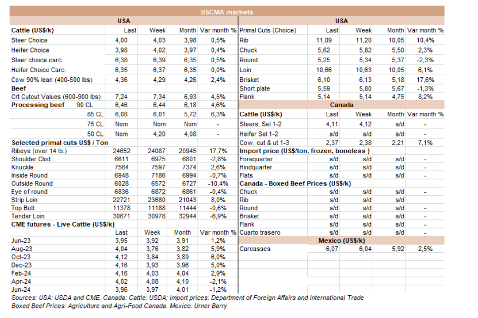 上周,在舊大陸夏季來(lái)臨之際,冰鮮牛肉市場(chǎng)走強(qiáng)。進(jìn)口市場(chǎng)消息稱,阿根廷產(chǎn)品的參考價(jià)格在12,800-13,200美元(FOB)之間,一些公認(rèn)的品牌達(dá)到13,400美元。烏拉圭參考價(jià)格則是在11,800-12,000美元的FOB價(jià)格。