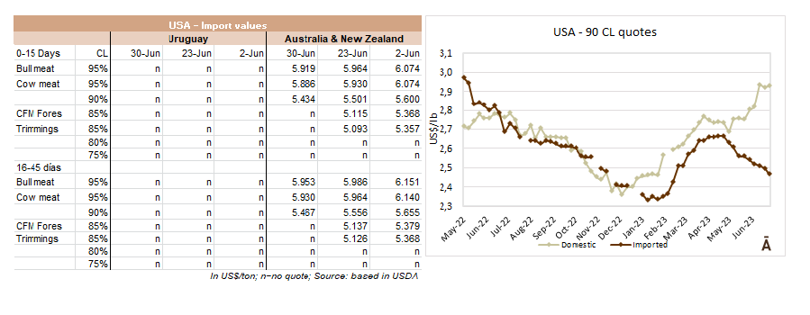 與前一周相比,美國(guó)進(jìn)口肉類價(jià)格大多適度下降,不存在大幅下降的情況,交易緩慢。獨(dú)立日假期前的需求弱于預(yù)期,對(duì)價(jià)格造成了壓力。根據(jù)美國(guó)農(nóng)業(yè)部的周報(bào),隨著季節(jié)性收獲的結(jié)束,澳大利亞和新西蘭的奶牛和公牛屠宰數(shù)量減少。