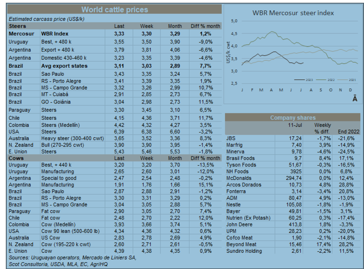 主要受到巴西升值的支持,本周WBR Mercosur 閹牛指數上升3美分,至每公斤3.33 美元。
