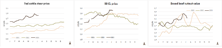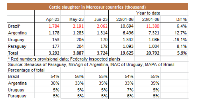 根據官方數據,6月份的牛屠宰量達到130萬頭。這是2023年迄今為止的最高月度屠宰量,比上月高出2%,年增長率為15%。此外,六月份是自2009年以來屠宰量最高的。