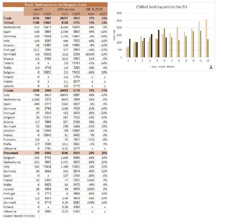 6月,巴西向歐洲聯盟(歐盟)國家出口了4336噸牛肉,其中2988噸為冷凍牛肉,1348噸為冰鮮牛肉。冷凍量每月收縮4%,而冰鮮收縮量為28%