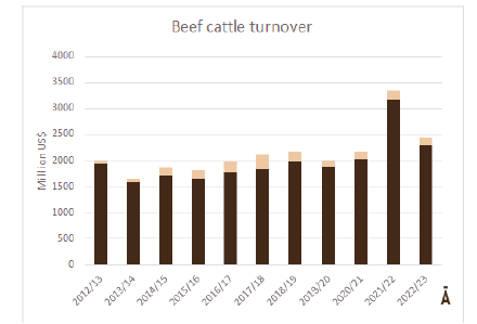 2022/2023財年,牛的最終銷售額約(包括屠宰和活牛)24.5億美元,年降幅為9億美元(-27%),當時開具了33.4億美元的發票。銷售量和平均銷售價格下降導致了牛營業額的下降。