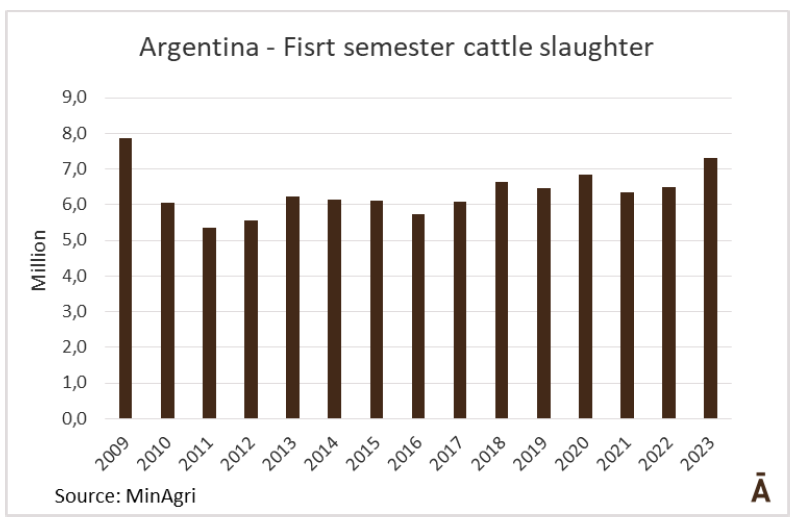 6月份和這半年的阿根廷牛肉屠宰量是自2009年以來產量最高的