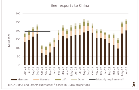 6月,南方共同市場到中國的出口量達到了創紀錄的20.1萬噸,其中13.5萬噸來自巴西,5萬噸來自阿根廷,1.6萬噸來自烏拉圭。這些貨物將在7月中旬至8月中旬到港。除此之外,大洋洲國家還出口了37000噸。