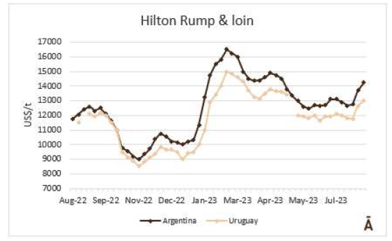 上周,希爾頓配額范圍內的冰鮮市場再次走強,阿根廷的臀腰肉價格在FOB 14000-14500美元之間。一位歐洲貿易商評論道:“目前,歐洲沒有足夠的產品,這也有助于價格上漲。此外,市場上的肉類數量有限,因此需求狀況良好。”