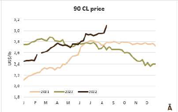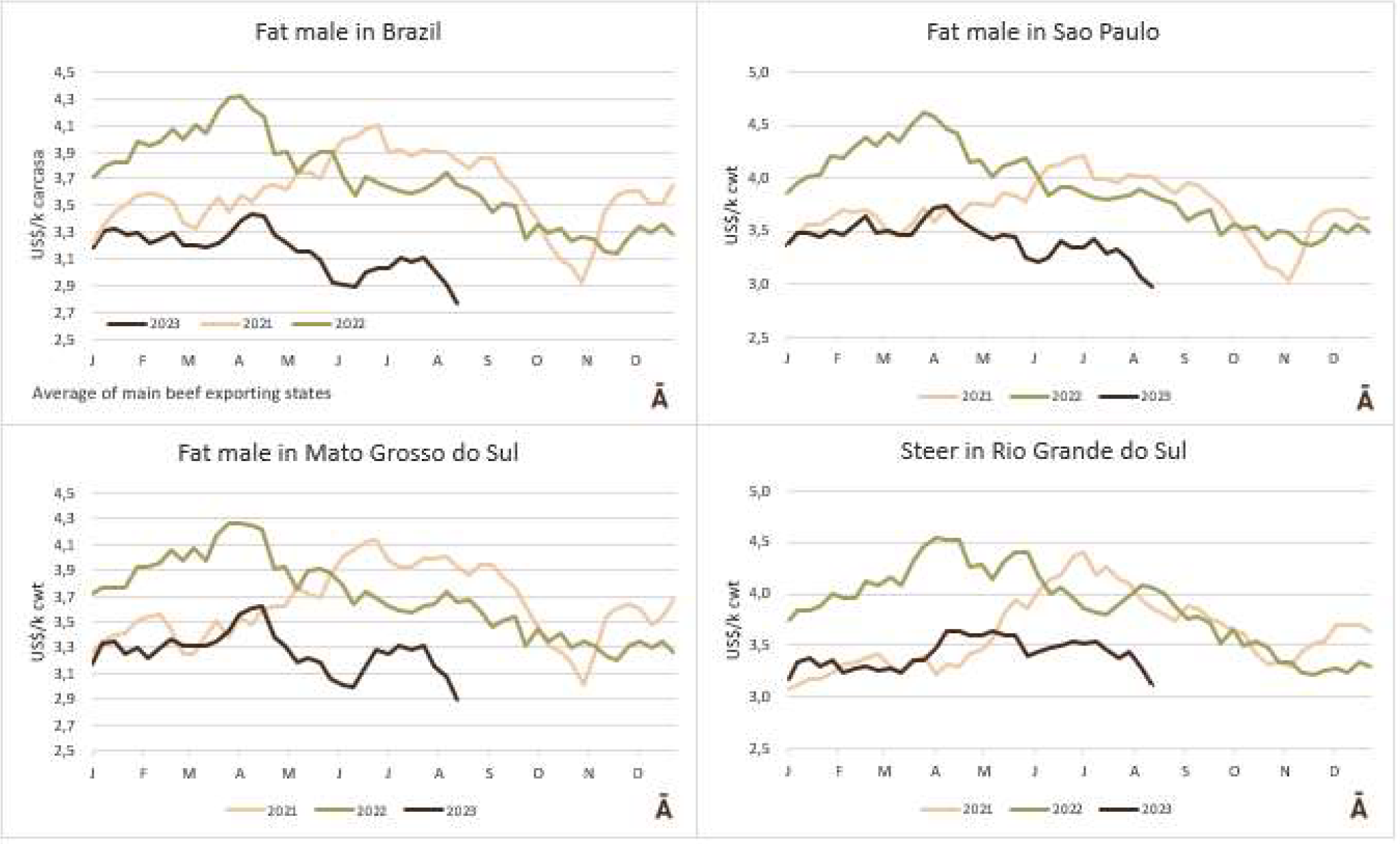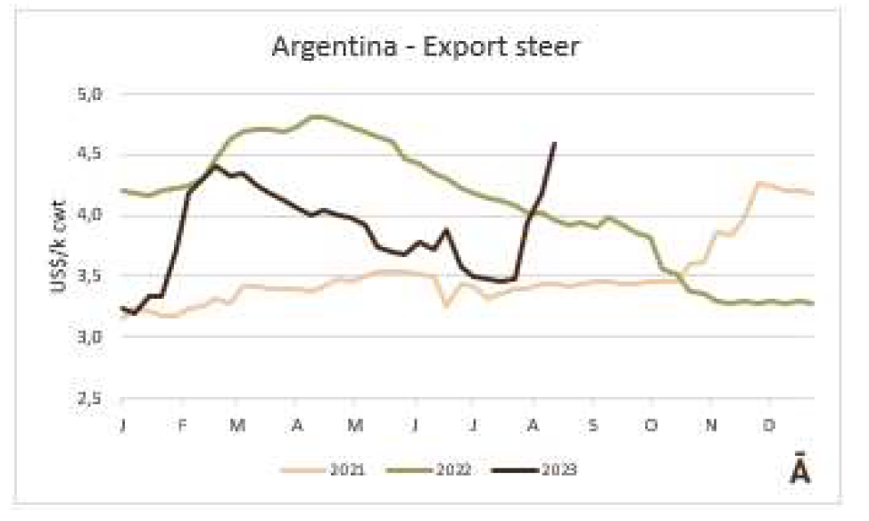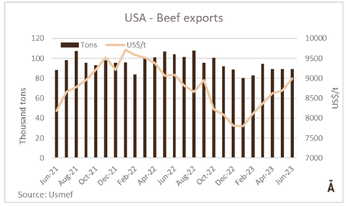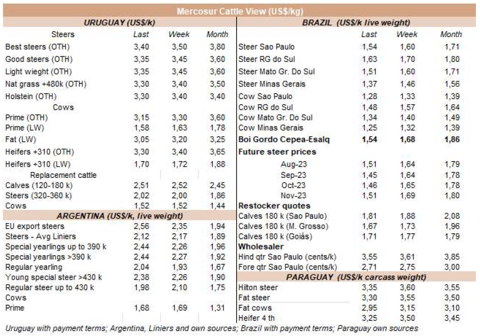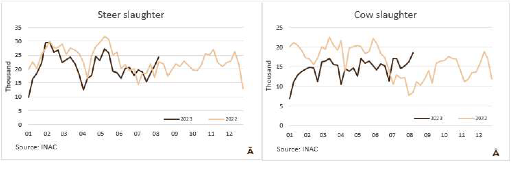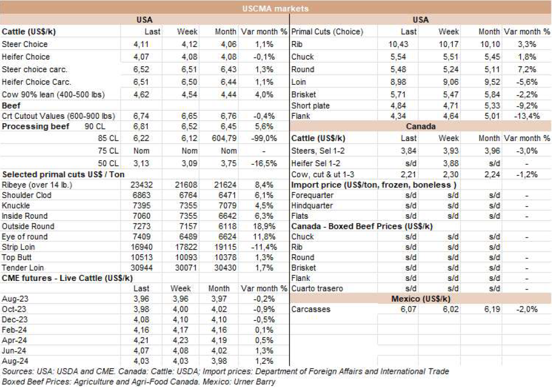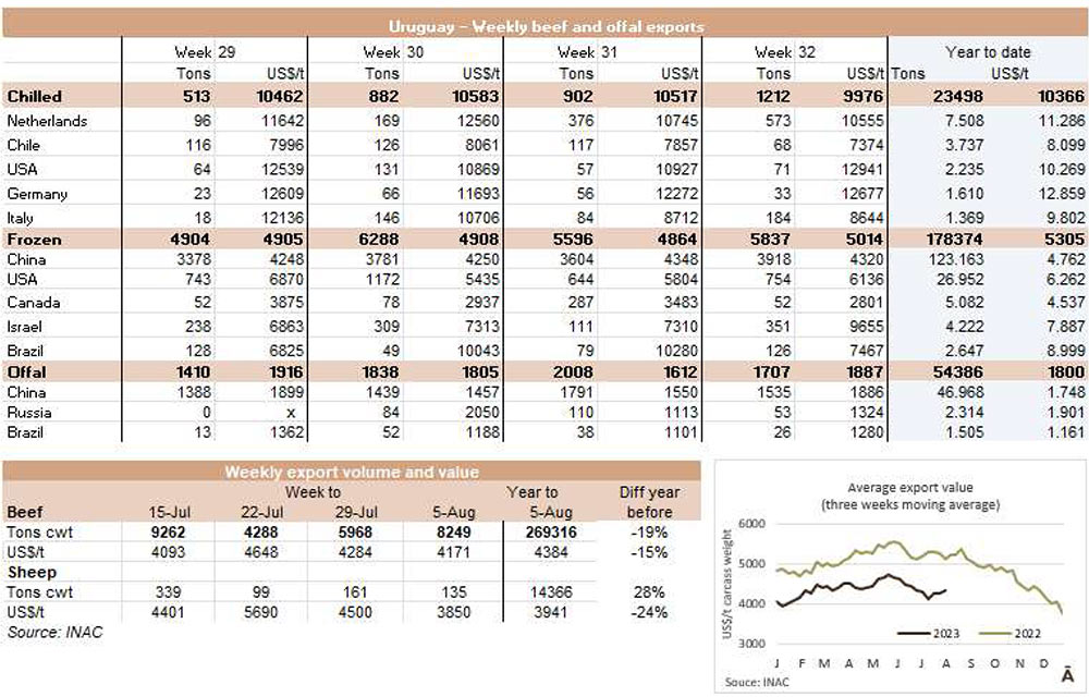 根據外貿部的數據,8月第二周,巴西以每噸4482的平均價格出口了42077噸牛肉。平均價格為4500美元/噸,比6月第一周的平均價格每噸低600美元(-13%)。在8月的前9個工作日,巴西以每噸4507的平均價格出口了83344噸牛肉。預計月底的產量將略低于20萬噸,這意味著與2022年8月的20.3萬噸相比將略有下降。