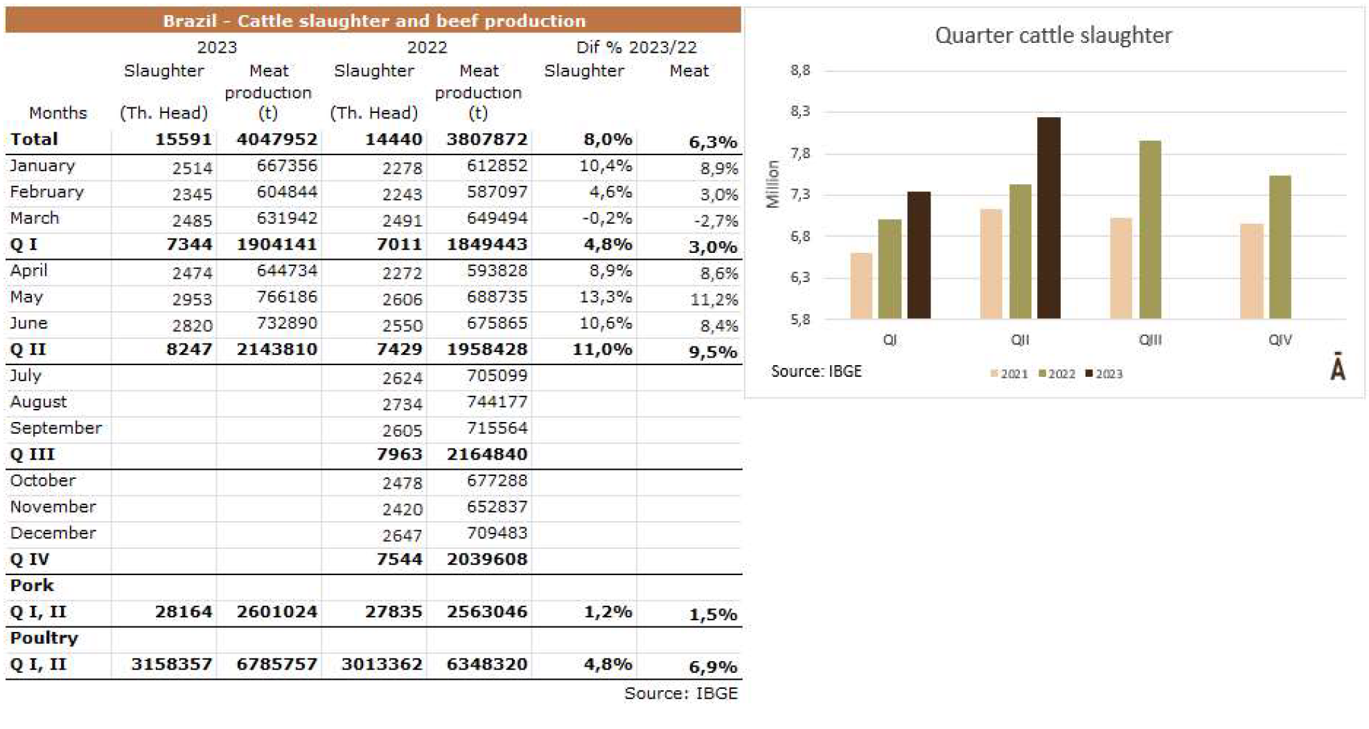 根據IBGE發布的畜牧業生產統計的初步結果,2023年第二季度,巴西有825萬頭牛在某種類型的衛生檢查下被屠宰。與2022年第二季度相比,這一數量增長了11%,與2023年第一季度相比增長了12.3%;與前三個月相比,增加了90.3萬頭。2023年第二季度214萬噸牛肉胴體的產量,意味著與上年同期相比增長9.5%,與2023年第一季度相比增長12.6%。由于屠宰量的增加是由于被送往屠宰場的雌性數量增加,因此酮體的重量往往會減少。該季度平均體重為260公斤,比2022年同期減少3.7公斤。與此同時,豬肉產量總計130萬噸,同比下降0.3%,而家禽產量增加330萬噸,同比增長7.2%。