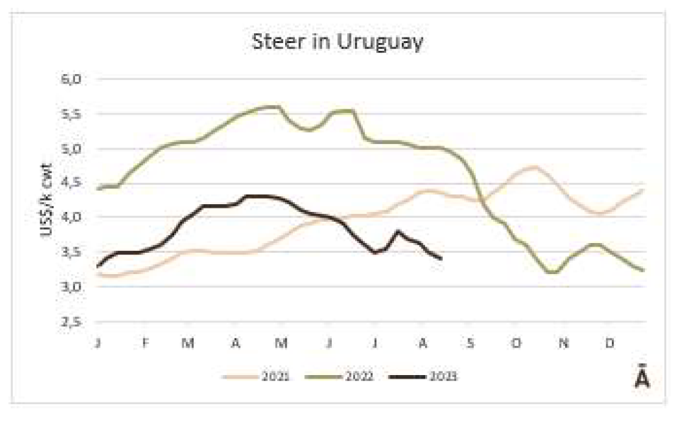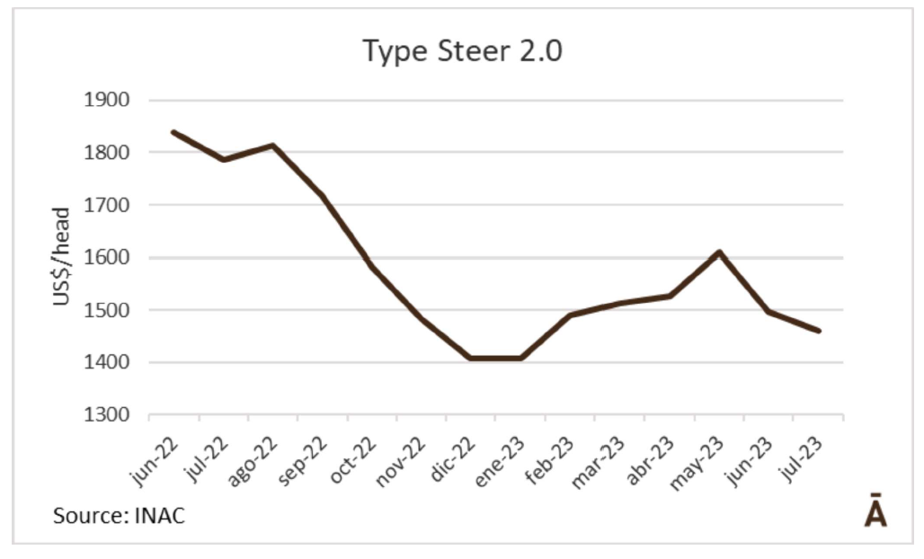 INAC 閹牛類型價值2.0在6月份跌了100美元以上后,7月份每頭又下跌36美元至1461美元。INAC閹牛類型價值預計了銷售烏拉圭特質公牛所有產品中獲得的收入,并按比例考慮了在國外和當地市場的布局。由于出口和國內市場胴體價格下跌導致閹牛類型價值下降。另一方面,內臟和副產品的價值以及生皮的價格也保持穩定。7月份,公牛的價格下降了5.1%(61美元)至1133美元/頭。另一方面,工業增加值在月度比較中每頭回升25美元(+8.3%)。