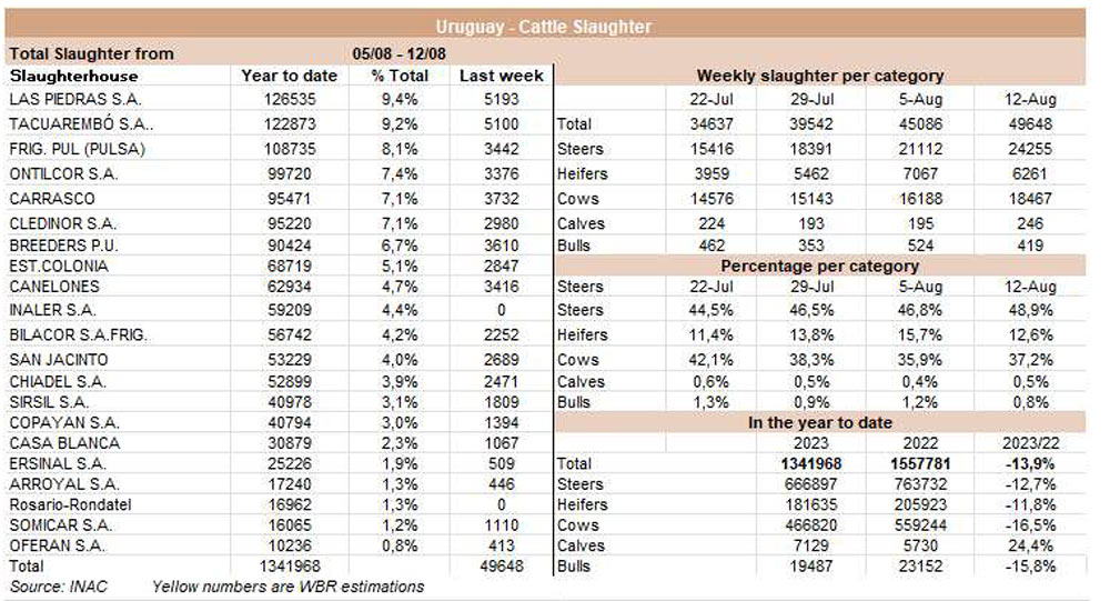 上周的牛屠宰量接近5萬頭,是自5月第二周以來數量最多的一周,當時屠宰場也在積極為481配額窗口工作。INAC報告稱,在截至8月12日的一周內,有49648頭牛進入工廠,比前一周增加了10%,比去年同期的37000頭增加了33%。屠宰量最大是Las Piedras(5193)、Marfrig-Tacuaremb6(5100)和Minerva Carrasco(3732)。擁有三個工廠的Marfrig屠宰了10927頭牛(周比較為-255頭),而同樣擁有三個工廠的Minerva屠宰了10590頭牛(周增加3552頭)。Marfrig lnaler本周再次開始恢復生產,而Cledinor下周將進入許可期。就Minerva而言,從下周開始,它將進入卡拉斯科工廠的許可期。截至8月,共有86907頭牛被屠宰,比去年同期多36%。事實上,牛的屠宰量將連續第二個月高于2022年。