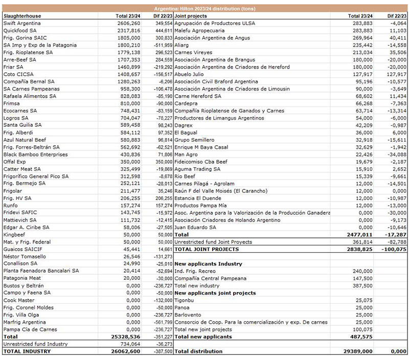 巴西公司Swift(Minerva)、Quickfood(Marfrig)和阿根廷Gorina、Imp.Y Exp.De la Patagonia(Supermercados la Anonima)和Frigorifico Rioplatense是希爾頓2023/24年配額的五大主要贏家,累計10308噸,占總數的35%。除La Anonima外,其他四家在2022/23財政年度增加了希爾頓配額范圍內的參與度。