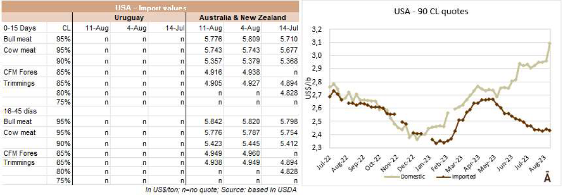 上周,美國進口市場價格沒有發生大的變化。根據一位貿易商的說法,配額范圍內的烏拉圭90CL牛前,參考價格仍在CFR 4550美元左右。智利牛肉市場的大型零售企業正爭分奪秒地試圖淘汰9月初到期的牛肉。據消息人士透露,巴西和巴拉圭的19分體價格為CIF 5300美元至5400美元之間。另一方面這兩個供應商第一季度的牛前價格分別為4900-5000美元。
