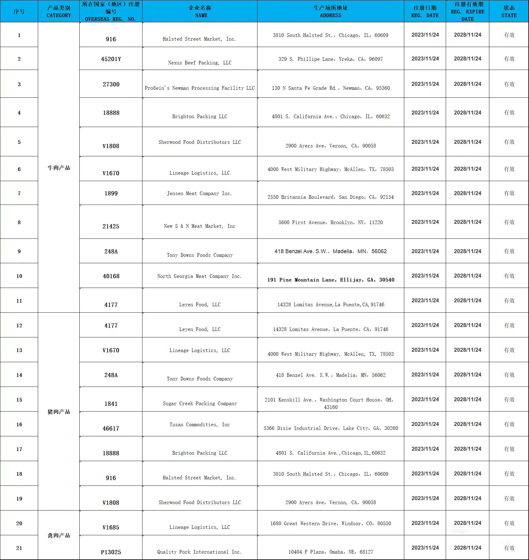 獲準輸華!(牛肉11家、豬肉8家、禽肉2家)