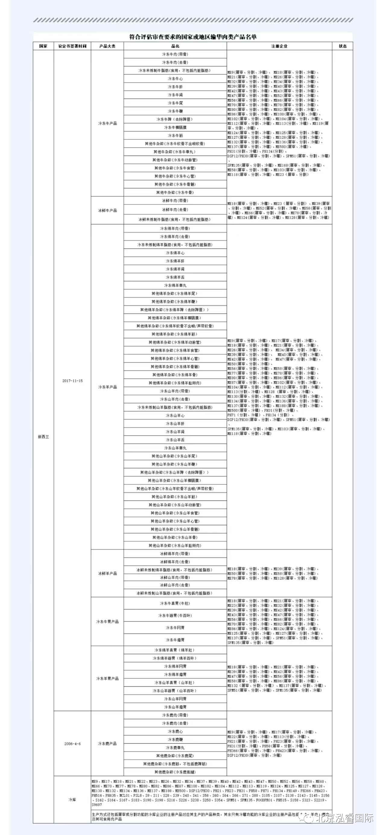 符合評估審查要求的國家或地區輸華肉類產品名單更新